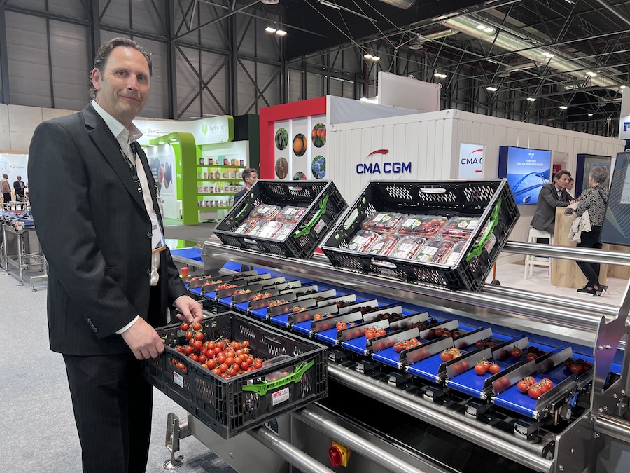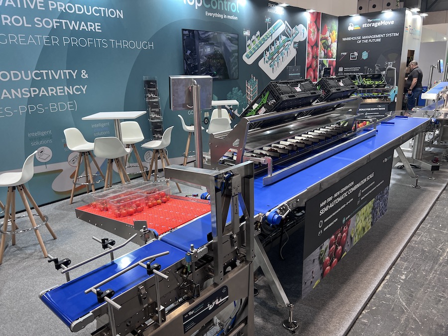 En el stand de TopControl en la feria Fruit Attraction 2025 en Madrid mostrando la maquina MHP3100 para el pesaje de clamshells de uva de mesa o tomates.