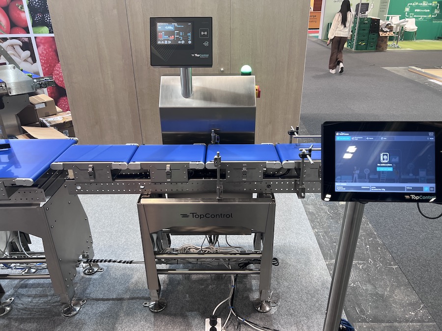 En el stand de TopControl en la feria Fruit Attraction 2025 en Madrid mostrando la maquina MHP3100 para el pesaje de clamshells de uva de mesa o tomates.